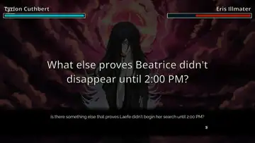 Pour y remédier, Tyrion Cuthbert prend une décision audacieuse au sein même de son écriture. On ne se concentre plus désormais sur le « Qui » mais sur le « Comment » de chaque affaire – tellement, par ailleurs, que le jeu continuera d’innover graduellement, nous mettant dans des situations où l’on doit remettre en question notre propre parole et interprétation de la réalité. Le jeu est certes facile, dans le sens où il est aisé de déterminer qui est le coupable, mais en modifiant la structure même du gameplay, Tyrion Cuthbert a trouvé la clé pour faire en sorte que cela n’aie aucune importance.
